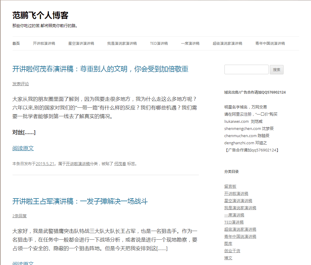 介绍:范鹏飞的自媒体个人博客网站,用于记录个人生活,留住美好!同时分享开讲啦、星空演讲、我是演说家、一席、TED、青年中国说、超级演说家演讲稿等文字版讲稿!