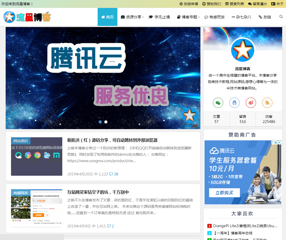 介绍:流星博客(Liues.cn),由一个高中生搭建的博客平台。本博客分享各类技术教程,网站源码,感想心得等为一体的半技术类博客网站。每天光临本博客,你都会有前所未有的新鲜感!