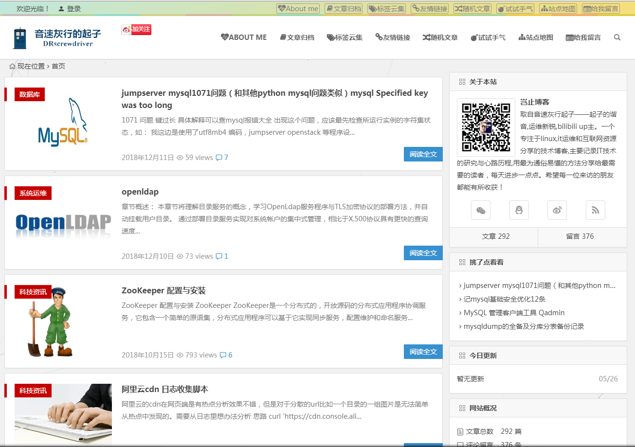 介绍:岂止博客, 取自音速灰行起子——起子的谐音, 运维新锐,bilibili up 主,这是一个专注于 linux,和资源分享的技术博客,主要记录 IT 技术的研究与心路历程。由 it 系统运维、wordpres 优化经验、SEO 优化、资源分享等栏目组成,涵盖了各类资源、Linux、MySQL、PHP、SEO 等。