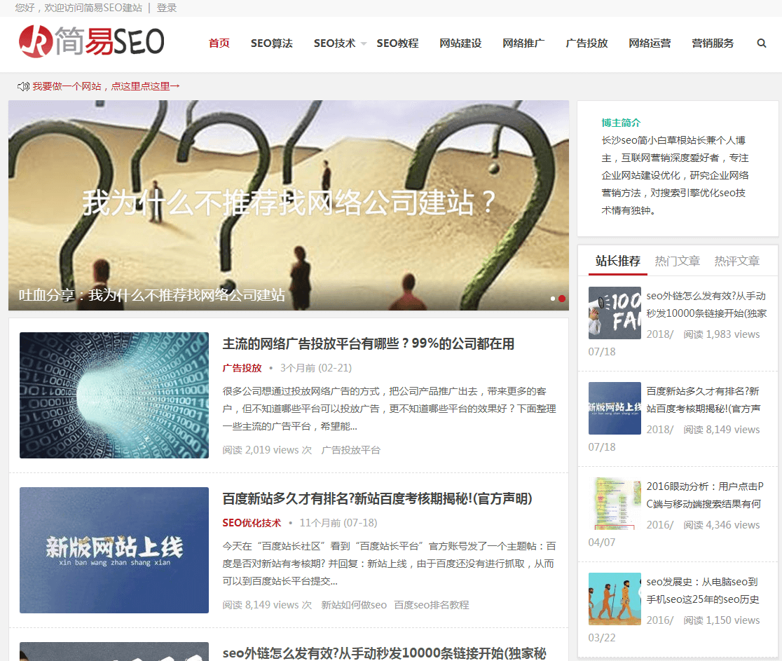 介绍:简易 SEO 博客,湖南长沙 seo 顾问首选! 搜索引擎优化 (seo 技术) 是企业网站建设、营销推广必备技能,实力分享网站优化及建站推广技术,提供 seo 顾问、seo 建站、网络推广外包、关键词排名等服务。