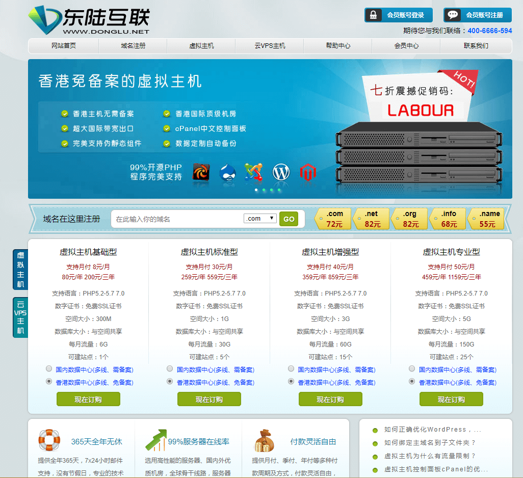介绍:东陆互联专业提供域名虚拟主机空间申请等服务, 国内为数不多的提供 Cpanel 控制面板的虚拟主机供应商, 提供国内主机, 香港虚拟主机, 独立 IP 虚拟主机,Linux 虚拟主机,PHP 虚拟主机, 免备案虚拟主机, 国内虚拟主机, 网站空间,VPS 主机, 云主机, 香港主机, 香港 VPS,cpanel 虚拟主机,cpanel 空间等