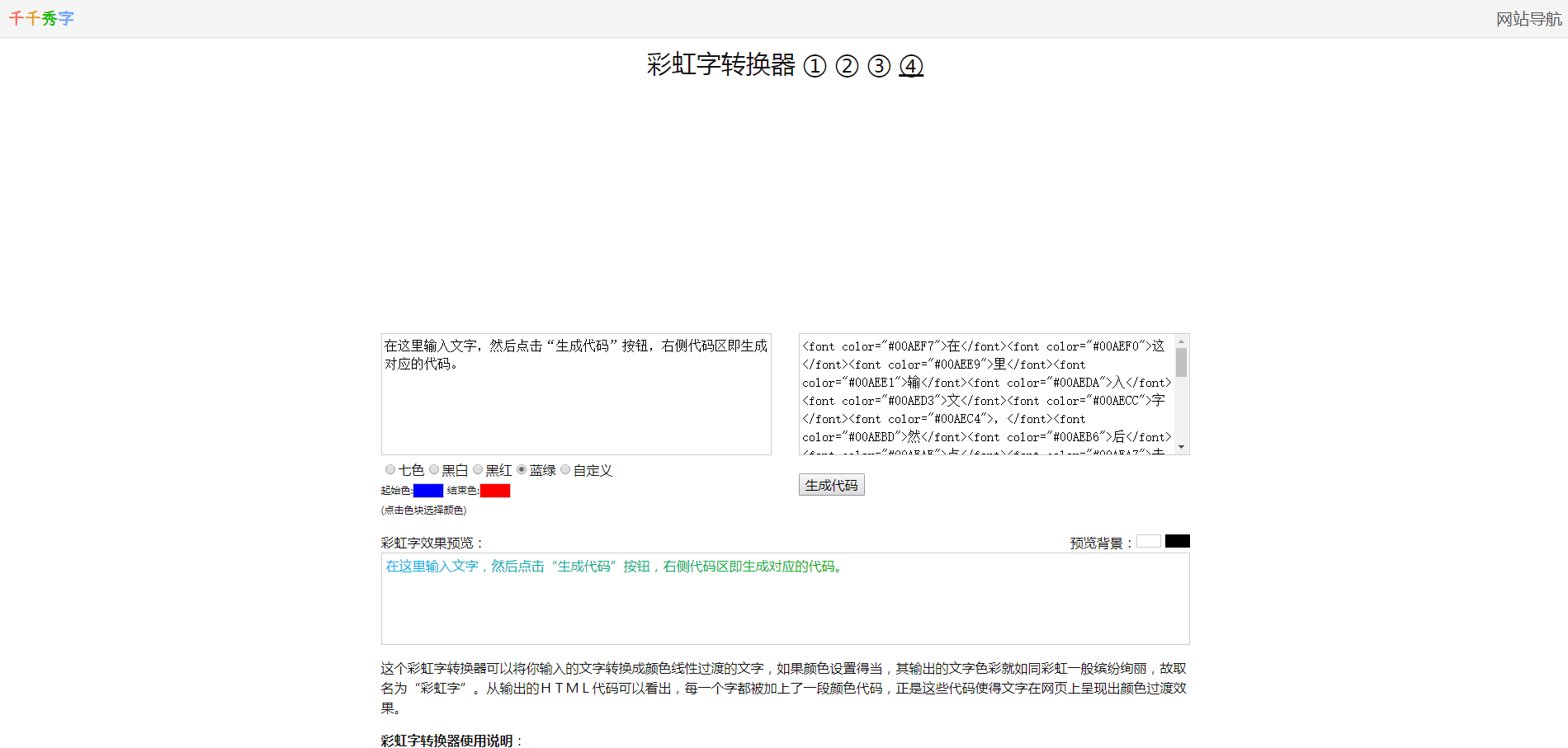 改网站支持手动调整渐变色字体的起始颜色以及结束颜色,效果看上去还是非常不错的,本站的 七彩云 API底部的统计功能的渐变色文字就是在该网站生成的。