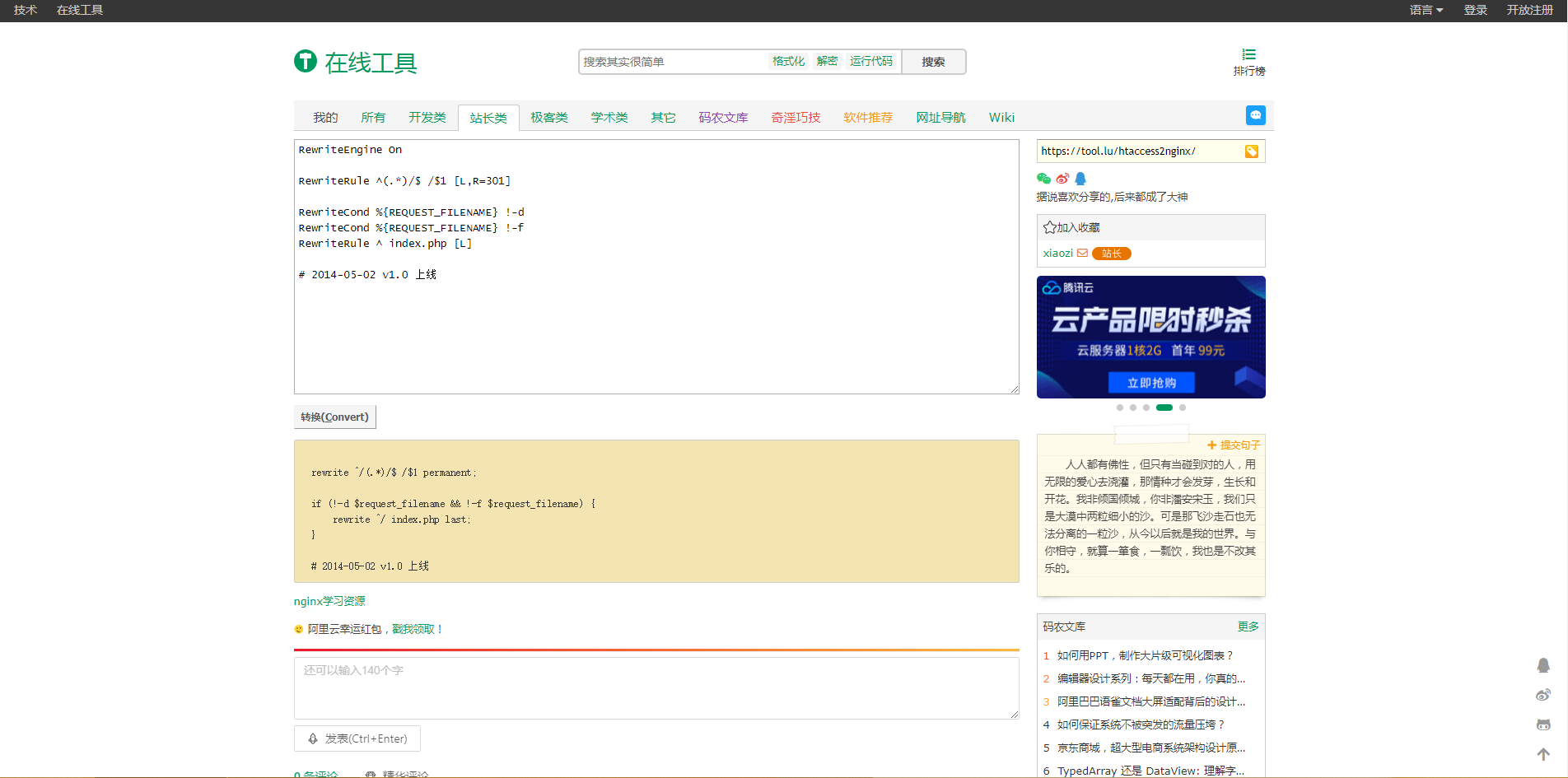 今天给大家分享一个工具网站,tool.lu,该工具站有很多的小工具供大家使用,今天只介绍其中一样,那就是标题所述的,htaccess 规则与 nginx 规则互转。 nginx 规则大家都知道,而 htaccess 则是 Apache 的规则,这些大家都知道,在此也是顺便一提。