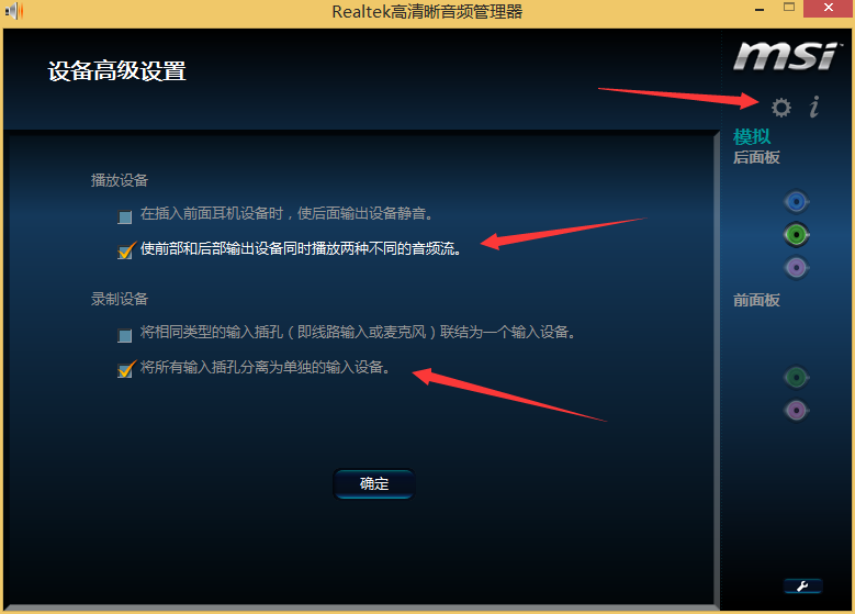 在弹出的窗口,依次勾选 ” 使前部和后部输出设备同时播放两种不同的音频流 ”+” 将所有输入插孔分离为单独的输入设备 ”。