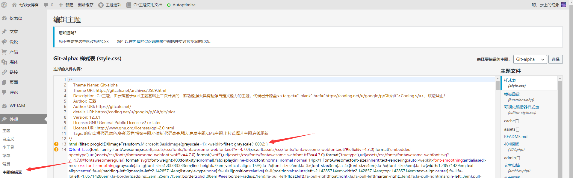 进入 WordPress 后台,外观 -> 主题编辑器 -> 样式表,找到 style.css 文件