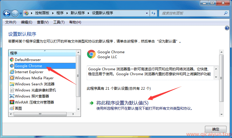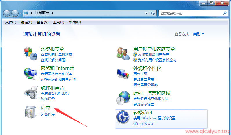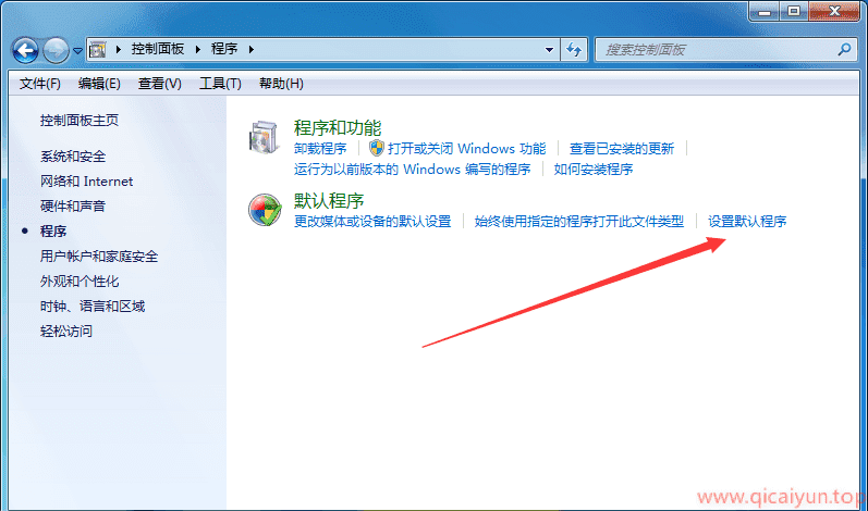 今天七彩云博客给大家说说,win7 系统下,如何锁定默认浏览器。我们以谷歌浏览器为例: 首先打开控制面板,如下图操作