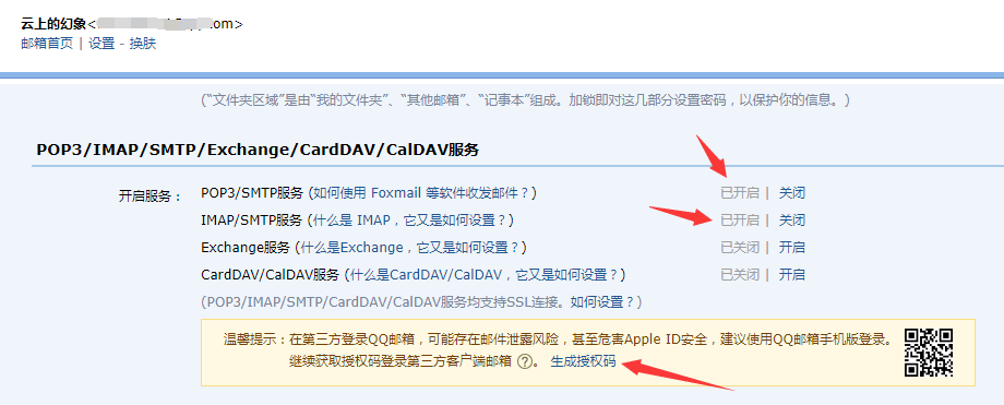 拉到网页下面,找到 ”POP3/IMAP/SMTP/Exchange/CardDAV/CalDAV 服务 ”(这里有一点要特别提醒一下,如果你需要使用 SMTP 服务,请依照下面红色箭头开启这些服务)