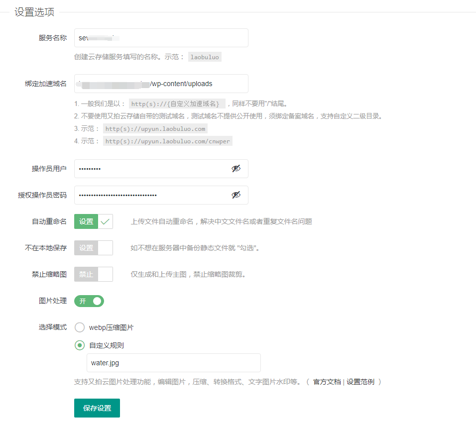 安装启用后,填入又拍云后台创建的存储空间名,加速域名,用户密码等,如下图: