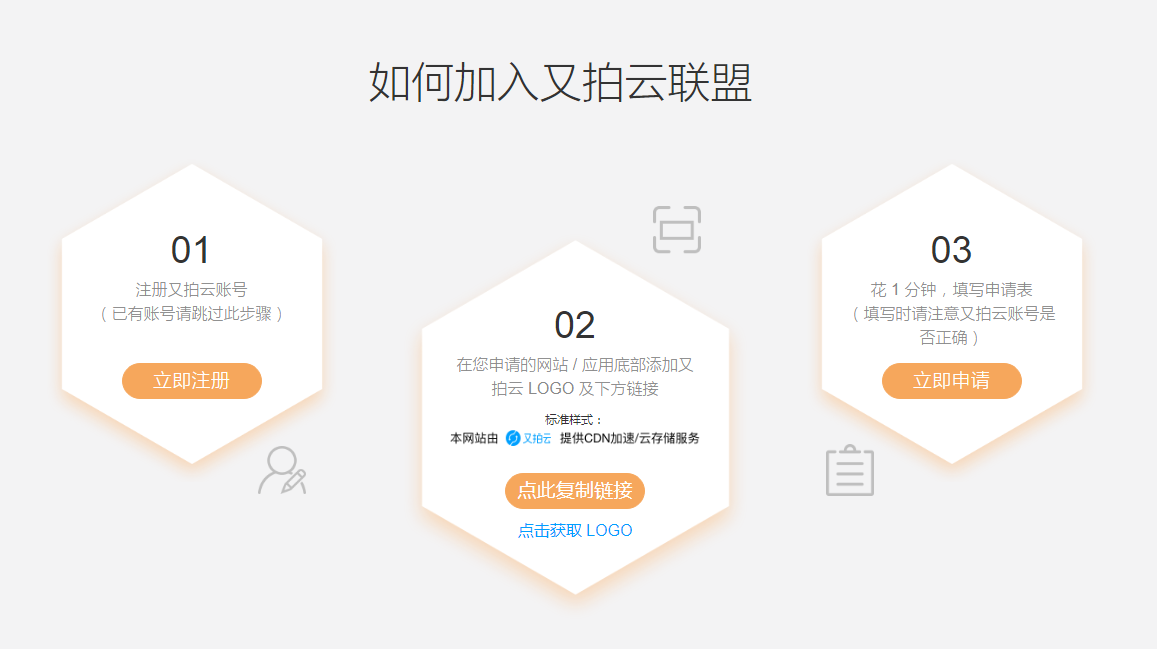 哦对了,这里再提下,又拍云的免费对象存储在哪里申请,打开该链接:https://www.upyun.com/league 进入到又拍云联盟,按照下图步骤操作: