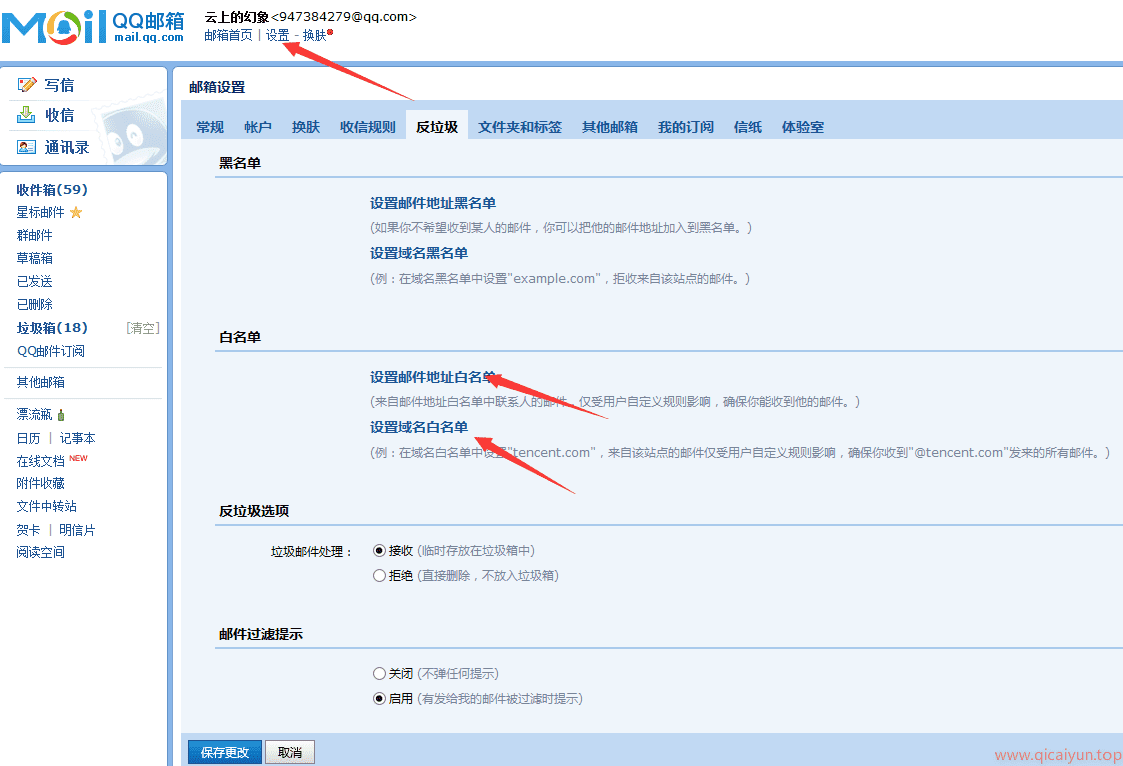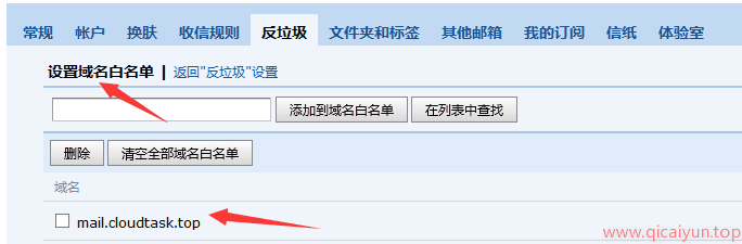 二:打开反垃圾选项,“设置域名白名单”,新增一条,内容为:“mail.cloudtask.top”