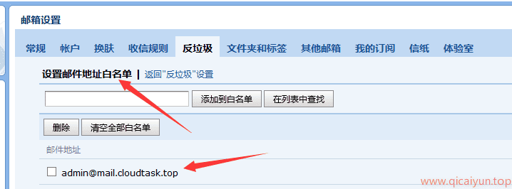 三:打开反垃圾选项,“设置邮件地址白名单”,新增一条,内容为:“admin@mail.cloudtask.top”