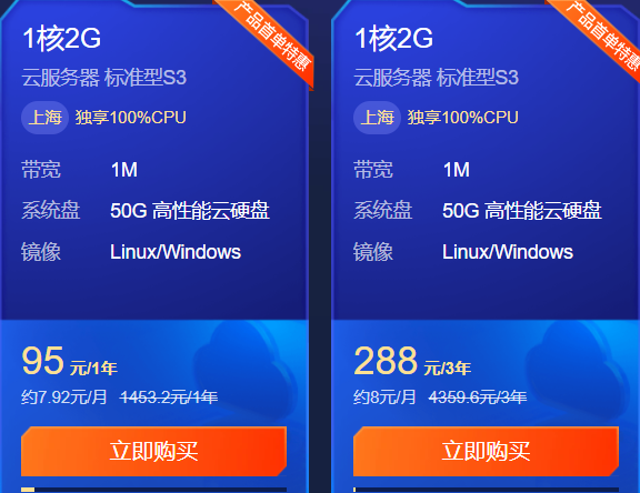 1 核 2G1M50G 盘,95 元 / 1 年