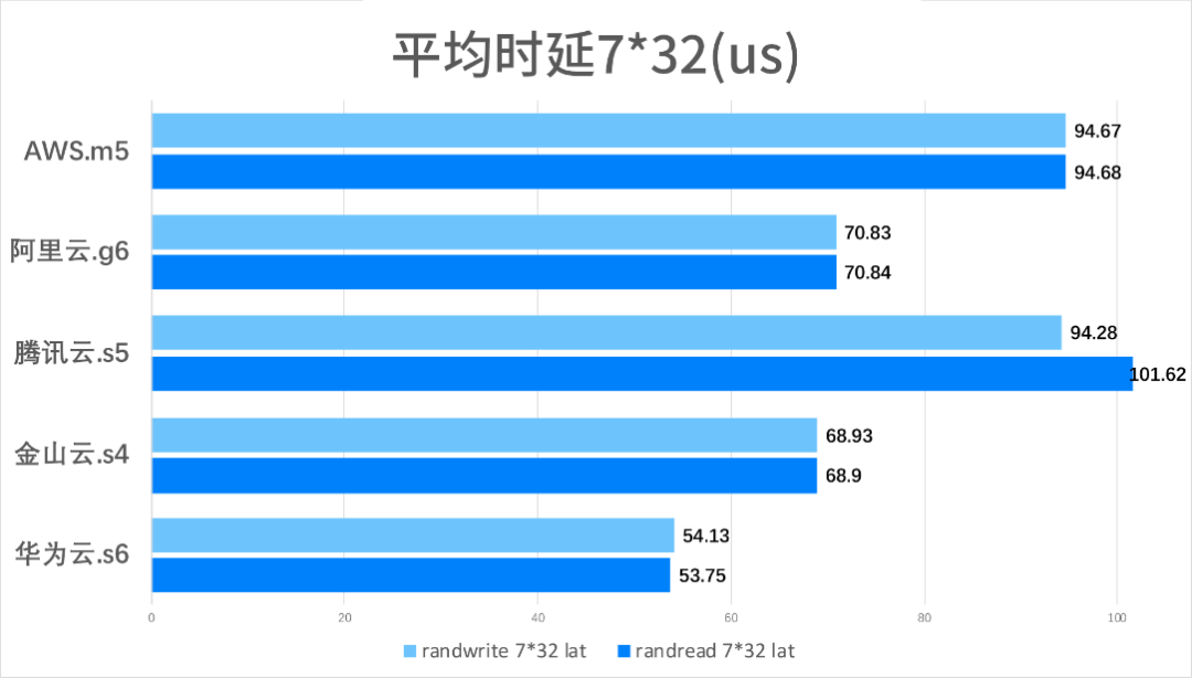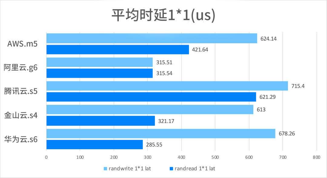 平均时延方面,在队列深度 1 * 1 时,阿里云 g6 读写最均衡、整体时延最少,其他四台云服务器相差不大;在队列深度 7 *32 时,华为云则要领先其他四台云服务器,金山云 s4 和阿里云 g6 次之。