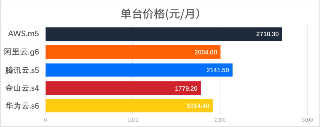 在价格上,金山云 s4 有较大优势,是唯一每月单价低于 1800 元的云服务器,其次为华为云 s6,定价也低于 2000 元,阿里云 g6 与腾讯云 s5 定价略高于 2000 元,而来自海外的 AWS m5 定价最高,达到 2710.3 元。