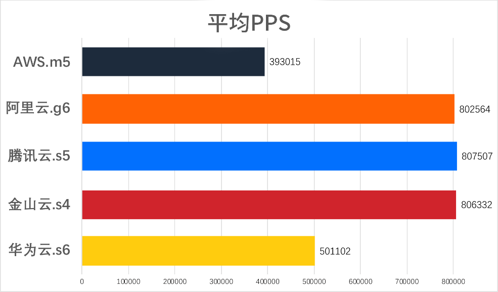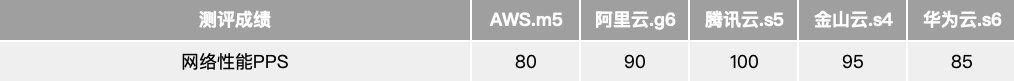 测试数据可看出腾讯云 s5 平均 PPS 排名第一,与金山云 s4 和阿里云 g6 同处第一梯队,每秒可处理超过 80 万个包,网络质量较好。