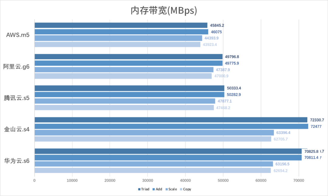 内存是除 CPU 之外,决定计算性能的关键性因素,尤其是针对大量访问内存的场景,如关系型数据库等。内存性能最主要的两个指标为内存带宽和内存延迟,本次采用基准测试工具 Stream 测评 Copy(复制)、Scale(乘法)、Add(加法)以及 Triad(三者复合)四种操作下的表现。