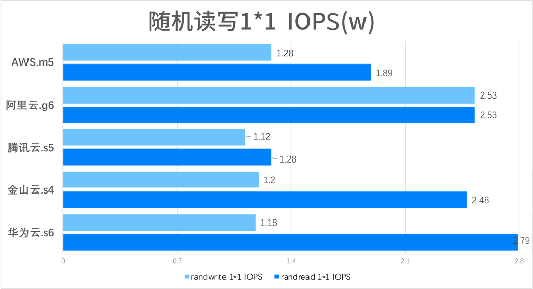 由上述随机读写 IOPS 图中可见,在队列深度 1 * 1 时,阿里云 g6 读写最均衡、整体领先,华为云 s6 的读数据单项排名第一,其他三台云服务器表现相差不大;在队列深度 7 *32 时,华为云 s6 表现出极大优势,读写 IOPS 均超过 33000,阿里云 g6 和金山云 s4 处于第二梯队,腾讯云 s5 和 AWS m5 则表现次之。