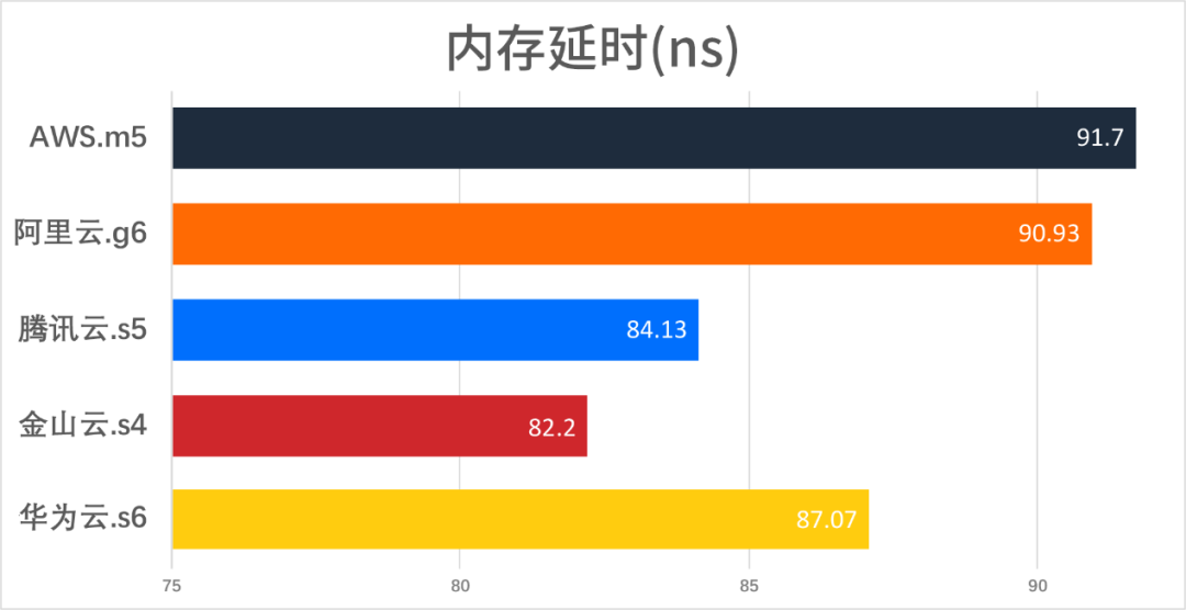 金山云 s4 内存延时最低,为 82.2ns,腾讯云 s5 与华为云 s6 也在 90ns 之内,阿里云 g6 和 AWS m5 在内存延时都超过了 90ns。