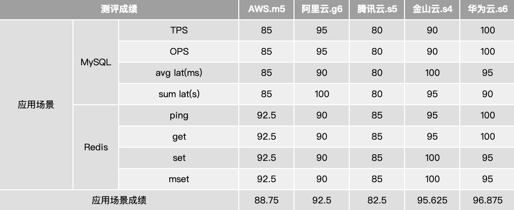 将上述每项测试中云服务器的表现排名汇总如下,分为四个部分:计算、存储、网络、应用场景。我们为每个部分不同的指标根据测试结果赋上相应的分数,其中第一名为 100 分,第二名为 95 分,第三名为 90 分以此类推(未获得准确结果的测试项分值为平均分,即 92.5 分);再为每个部分赋上权重比,云服务器的计算性能为最重要的指标,权重为 40%,存储性能其次为 25%,网络性能由于只有一个测试指标所以权重为 15%,应用场景的权重为 20%。总分由每个部分分数乘每个部分权重再求和得出,每个部分分数由每项指标的平均分数乘每项指标权重再求和得出。