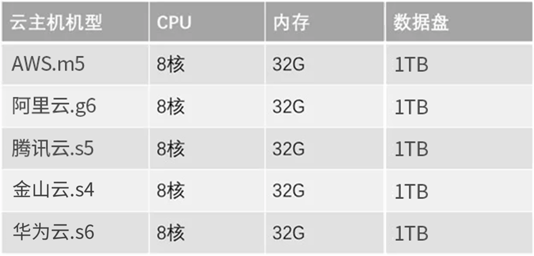 每个厂商都在北京地区(AWS 为韩国首尔地区)开启一台实例,均为搭载英特尔的 Cascade Lake CPU 的机型,同样选择 8 核 32G 的机型,详细配置如下: