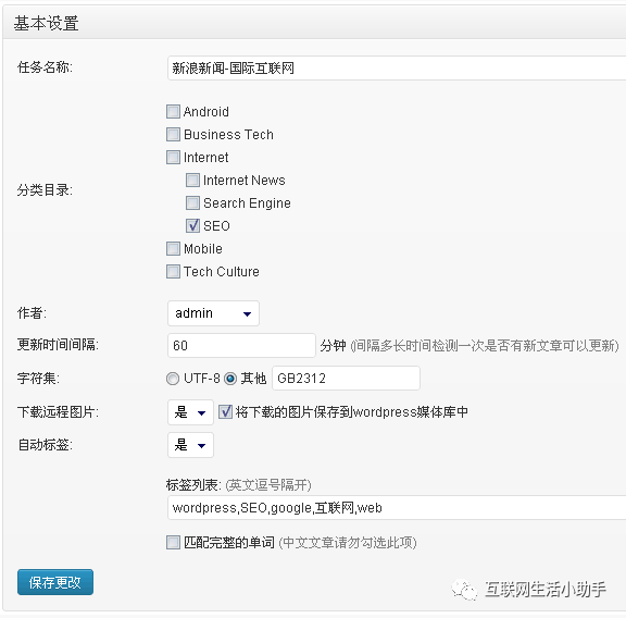 - 作者:该任务采集文章的发布作者,必须是 WordPress 里的注册用户
