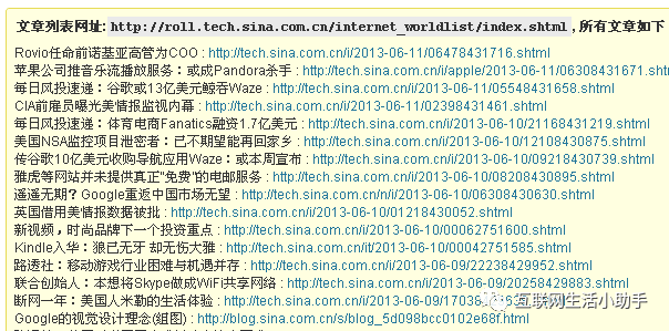 通过点击列表网址 http://roll.tech.sina.com.cn/internet_worldlist/index.shtml 上的文章,我们可以发现每篇文章的 URL 都为如下结构