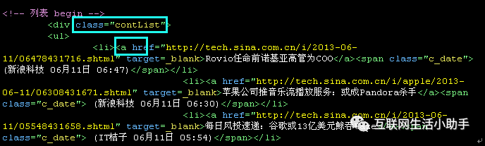 使用 CSS 选择器进行匹配,我们只需要设置 文章网址的 CSS 选择器 即可(不知道 CSS 选择器为何物,一分钟学会如何设置 CSS 选择器),通过查看列表网址 http://roll.tech.sina.com.cn/internet_worldlist/index.shtml 的源代码即可轻松设置,找到该列表网址下具体文章的超链接的代码,如下所示: