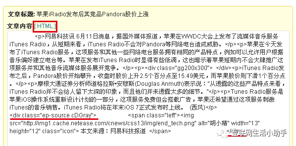 如下所示,我们通过测试抓取文章后发现文章里有不希望发布的内容,切换到 HTML 显示,找到该内容的 HTML 代码,分别设置两个关键词即可过滤掉该内容。