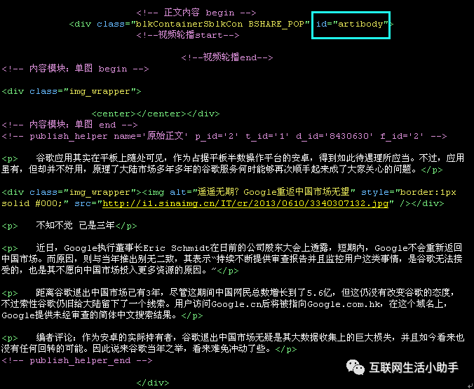 在文章来源设置里,我们以采集新浪互联网新闻为例,这里还是以该例子讲解,通过查看列表网址 http://roll.tech.sina.com.cn/internet_worldlist/index.shtml 下某一篇文章的源代码即可轻松设置,例如,我们通过查看某篇具体文章 http://tech.sina.com.cn/n/i/2013-06-10/06308430630.shtml 的源代码,如下所示: