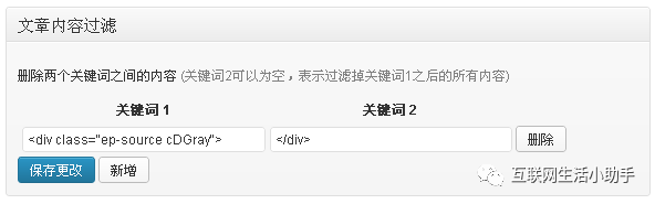 文章内容过滤功能,可过滤掉正文中不希望发布的内容(如广告代码,版权信息等),可设置两个关键词,删除掉两个关键词之间的内容,关键词 2 可以为空,表示删除掉关键词 1 之后的所有内容。