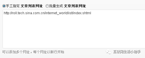 我们以采集新浪互联网新闻为例,文章列表网址为 http://roll.tech.sina.com.cn/internet_worldlist/index.shtml 因此在 手工指定文章列表网址 中输入该网址即可,如下所示: