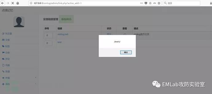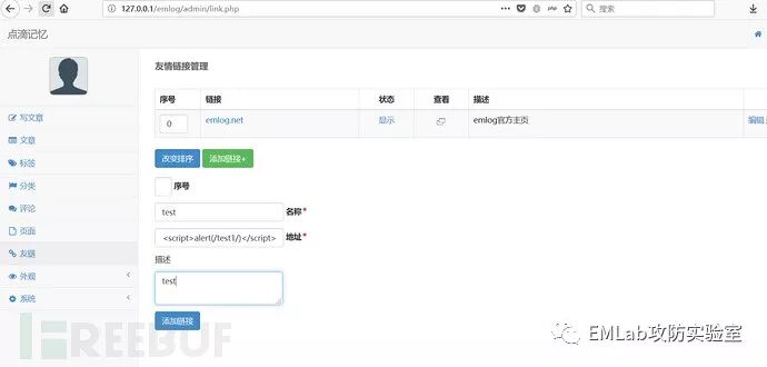 后台链接添加处 admin/link.php 【http://localhost/admin/link.php】,siteurl 参数输出时未进行实体化处理导致,存储型 xss。在 $action=addlink 时,通过 addslashes 函数进行转义处理,防止进行 sql 注入,但是未进行任何的 html 实体化,或者过滤处理。通过第 44 行代码可发现进行了正则匹配所以我们构造的 payload 需以 http、ftp 开头,才能进型数据插入。