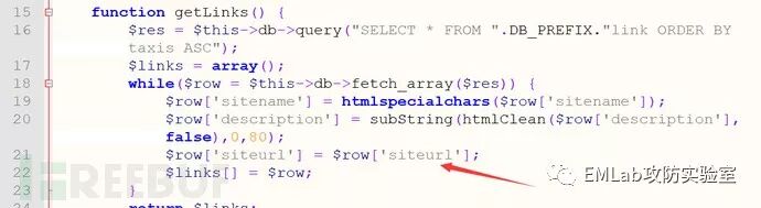 接下来跟进输出情况,当 action 参数为空,通过 /include/model/link_model.php 中的 Link_Model->getLinks()函数从数据库查询 sitename、description、siteurl,并返回查询结果,最后由 View::output()进行输出。getLinks()函数查询数据库获取,获取 sitename、description、siteurl 数据,查看可发现未对 siteurl 参数进行实体化和过滤处理。