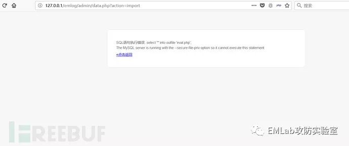 先尝试第一种方法,先备份 sql 语句,在其基础上插入 select into outfile‘eval.php’语句就 ok 了, 但是由于配置了 secure-file-priv, 所以 GG, 这个方法行不通。