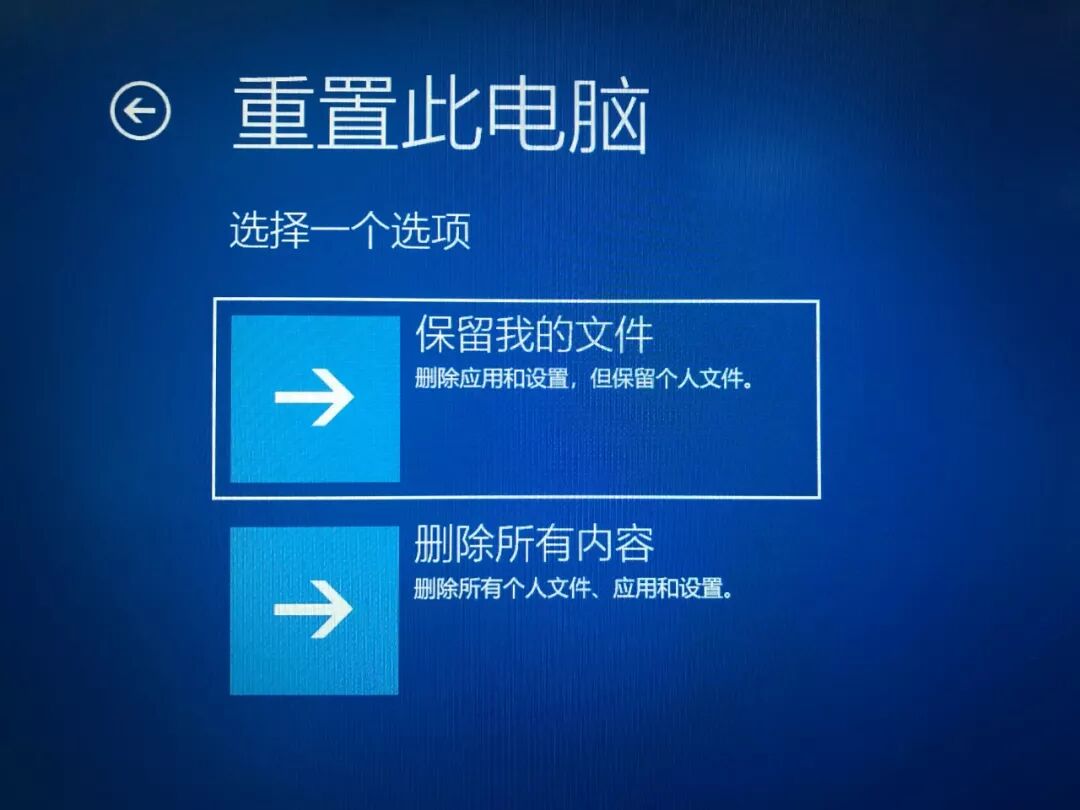 如果无法进入系统,而需要保留重要文件可以选择【重置此电脑】