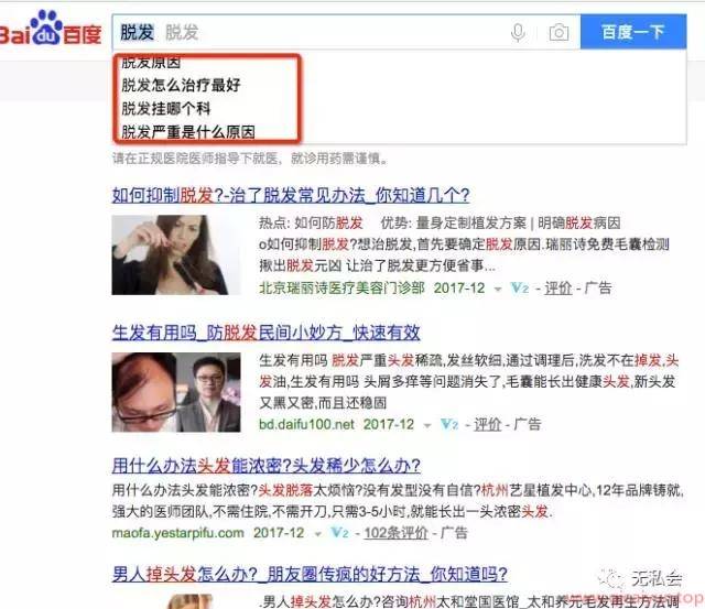 比如我们搜索“脱发”,下拉框中相应会出现一些相关的长尾词,如图: