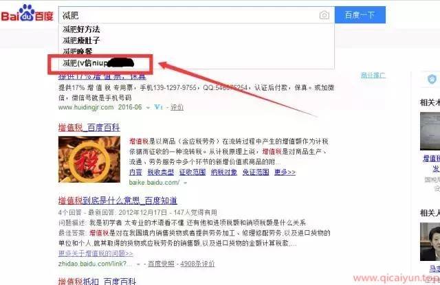 看到了吧,这就是广告,大家想想看加这个微信号的流量精准吧。只要你在百度里面输入“减肥”它就会出现这个下拉词,就能显示你的广告。