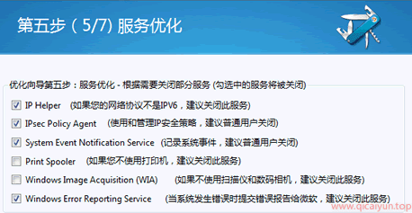 第四步里面罗列了 3 个建议关闭的服务(勾选中的服务保存后会被自动关闭并禁止下次启动加载):