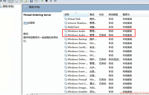 打开“服务”后,找到“windows audio”和“Windows Audio Endpoint Builder”服务后,如图: