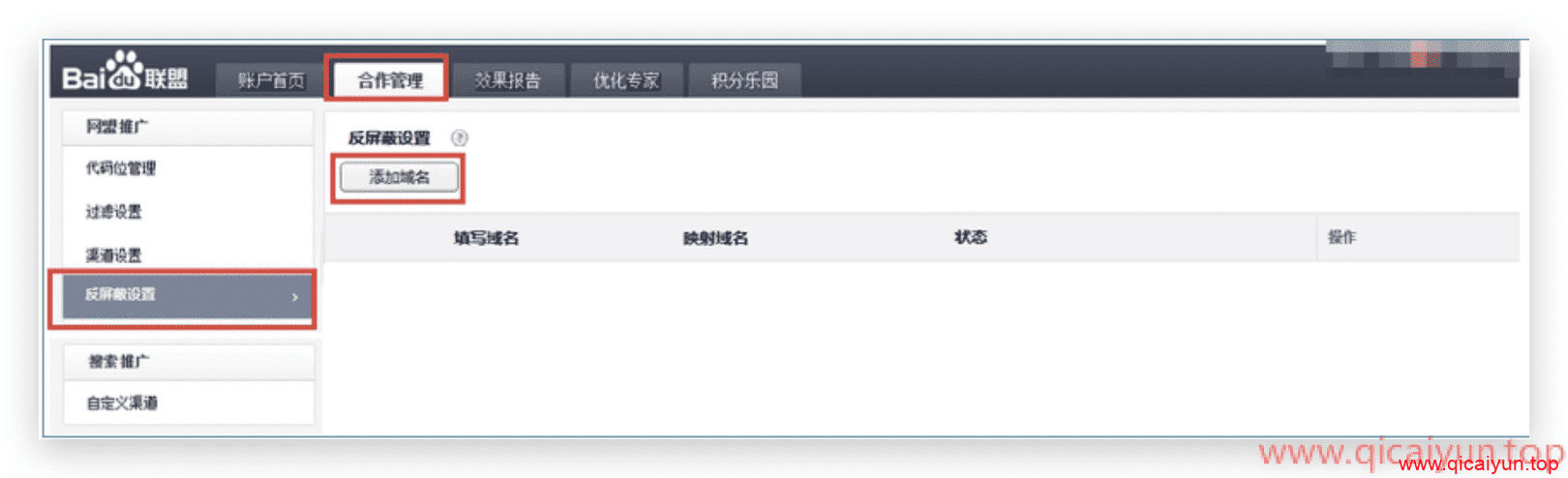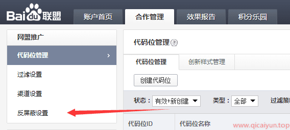登录百度联盟官网,找到左侧的反屏蔽设置,找不到也没关系,直接看下图: