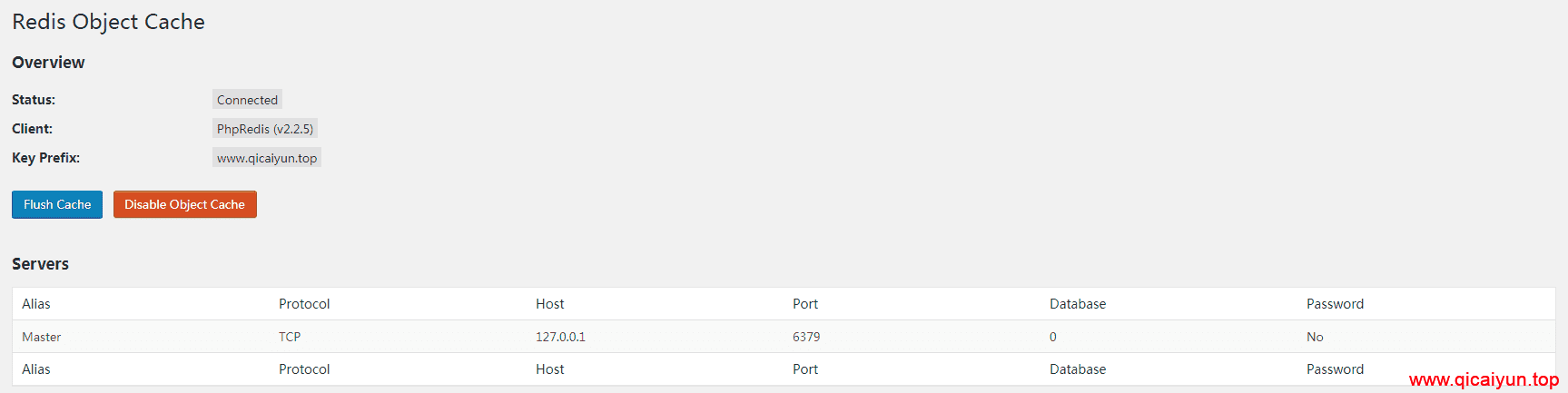 在更新环境后,之前使用的 memcached+opcache,memcached 却不能用了 (目前不支持 php7.x),于是在网上搜了一下很多人推荐 redis+opcache,既然得到了一个优化方案,咱就来折腾一下试试,不行再用其他方法好了。在 AMH 面板安装好 redis4.0+pecl_redis-2.2.7,pecl_redis-2.2.7 安装好后,需要对应你即将优化的环境再次安装。到这服务器端就暗转完毕了。下面要安装一下 WordPress 端,在网站后台搜索“Redis Object Cache”安装启用,在 wp-config.php 中添加 define("WP_CACHE_KEY_SALT",'www.qicaiyun.top');,出现下图样式即为启用成功: