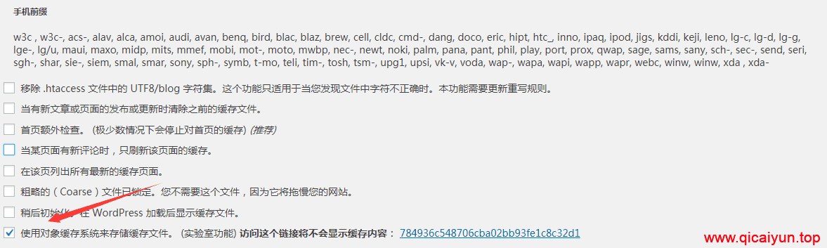 这里有一处需要注意,如果你安装了 wp super cache 缓存插件,需要到高级设置里,开启“使用对象缓存系统来存储缓存文件”,如下图所示: